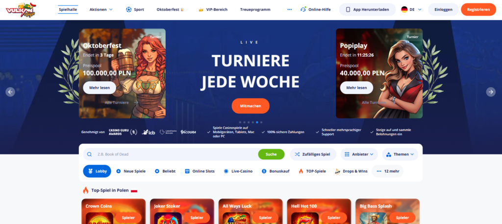 Vulkan Vegas ist ein etabliertes Online-Casino, das Spielern weltweit eine beeindruckende Auswahl an Spielen, großzügige Boni und ein benutzerfreundliches Erlebnis bietet. Mit über 2.000 Spielen, darunter Spielautomaten, Tischspiele und Live-Casino-Optionen, ist Vulkan Vegas eine Top-Adresse für Casinofans.